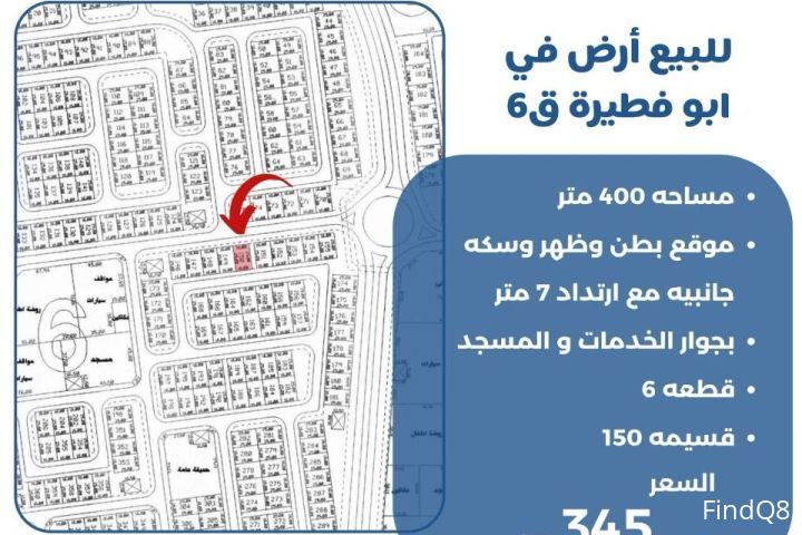 للبيع ارض في ابو فطيرة قطعة 6 مساحة 400 متر موقع بطن وظهر وسكه جانبية مع ارتداد 7 متر بجوار الخدمات والمسجد السعر 345 الف