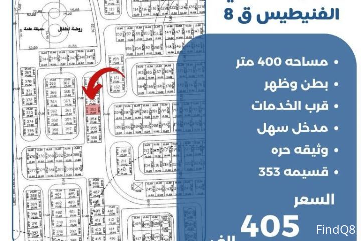 للبيع ارض في الفنيطيس قطعة 8 مساحة 400متر بطن وظهر قرب الخدمات مدخل سهل وثيقة حرة قسيمة 353 السعر 405 الف