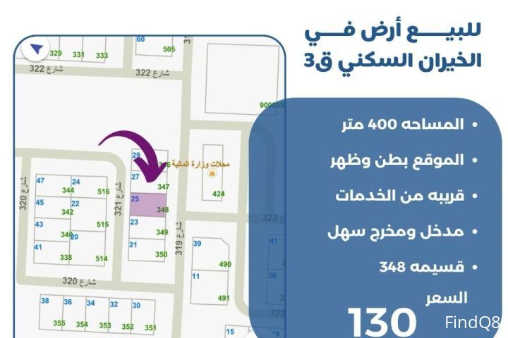 للبيع ارض في الخيران السكني ق3 المساحة 400 متر الموقع بطن وظهر قريبه من الخدمات مدخل ومخرج سهل قسيمة 348 السعر 130 الف