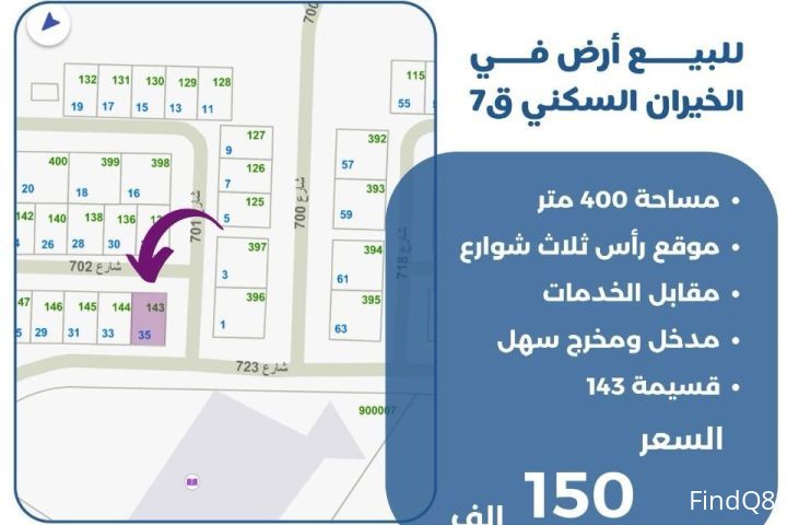 للبيع ارض في الخيران السكني قطعة 7 مساحة 400 متر موقع رأس ثلاث شوارع مقابل الخدمات مدخل ومخرج سهل قسيمة 143 السعر 150 الف