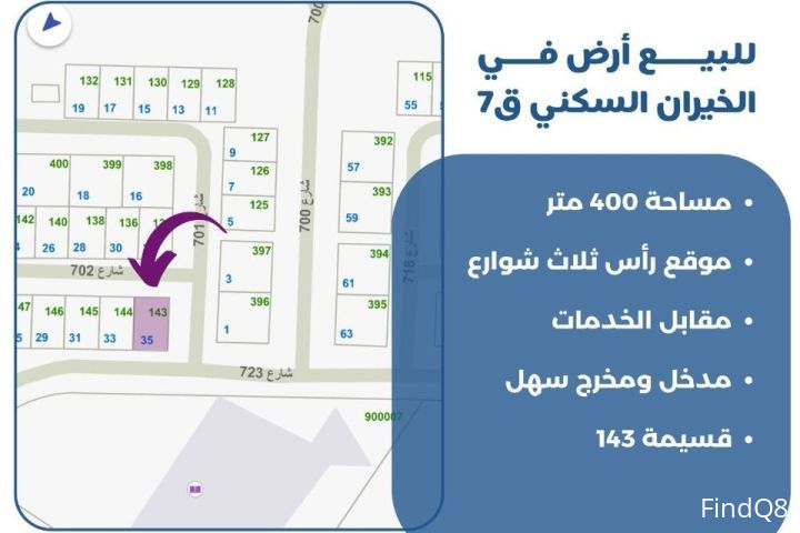 للبيع ارض في الخيران السكني قطعة 7 مساحة 400 متر موقع رأس ثلاث شوارع مقابل الخدمات مدخل ومخرج سهل قسيمة 143