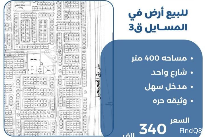 للبيع ارض في المسايل قطعة 3 مساحة 400 متر شارع واحد مدخل ومخرج سهل وثيقة حرة السعر 340 الف