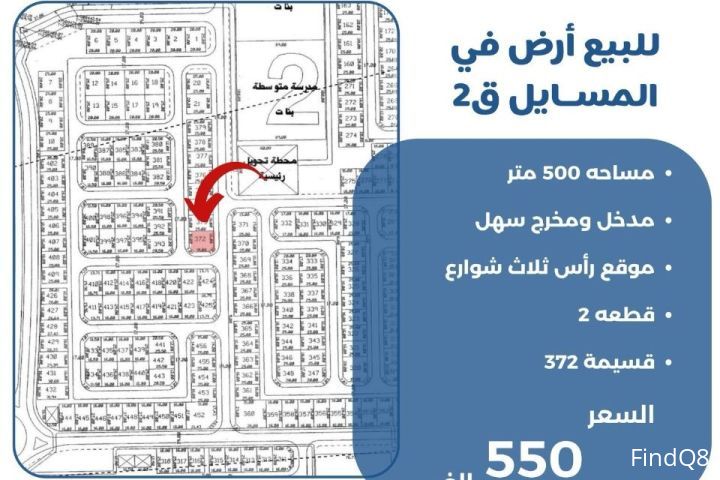 للبيع ارض في المسايل قطعة 2 مساحة 500 متر مدخل ومخرج سهل موقع رأس ثلاث شوارع السعر 550 الف