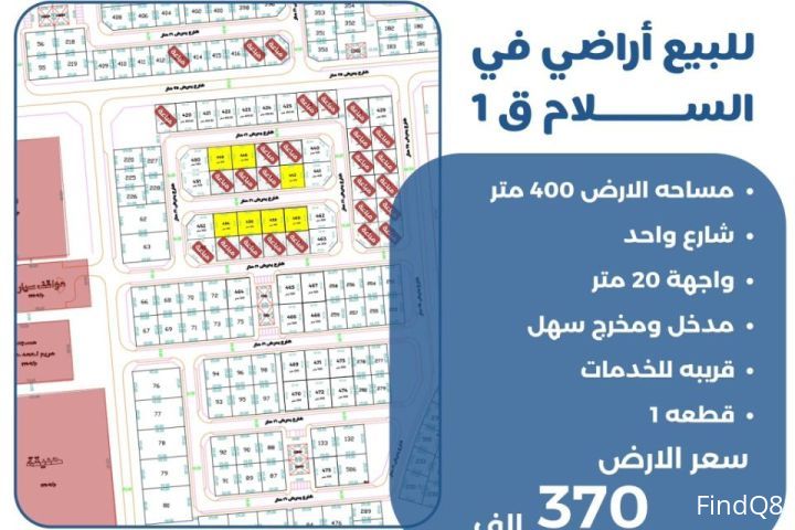 للبيع ارض في السلام قطعه 1 مساحة الارض 400 متر شارع واحد واجهه 20 متر مدخل ومخرج سهل قريبه للخدمات سعر الارض 370 الف