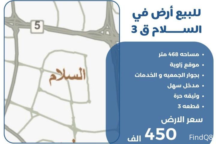 للبيع ارض في السلام قطعة 3 مساحة 468 متر موقع زاوية بجوار الجمعية والخدمات مدخل سهل وثيقة حره سعر الارض 450 الف