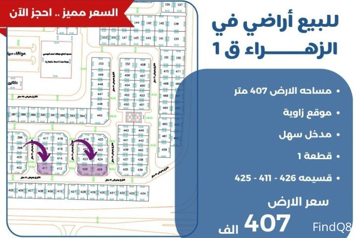 للبيع ارض في الزهراء قطعه 1 مساحه 407 متر موقع زاوية مدخل سهل قسيمة 411 سعر الارض 407 الف