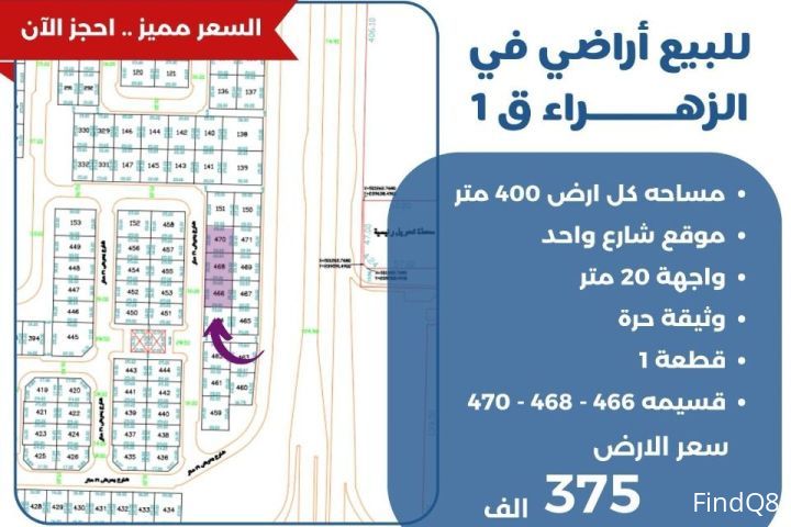 للبيع ارض في الزهراء قطعه1 مساحة كل ارض 400 متر موقع شارع واحد واجهه 20 متر وثيقه حره قسيمة 466-468+470 سعر الارض 375 الف