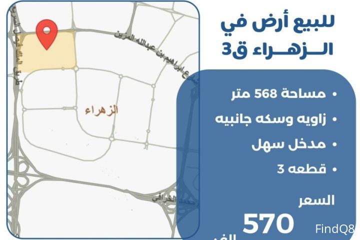 للبيع ارض في الزهراء ق3 مساحة 568 متر زاوية وسكه جانبيه مدخل سهل قطعة 3 السعر 570 الف