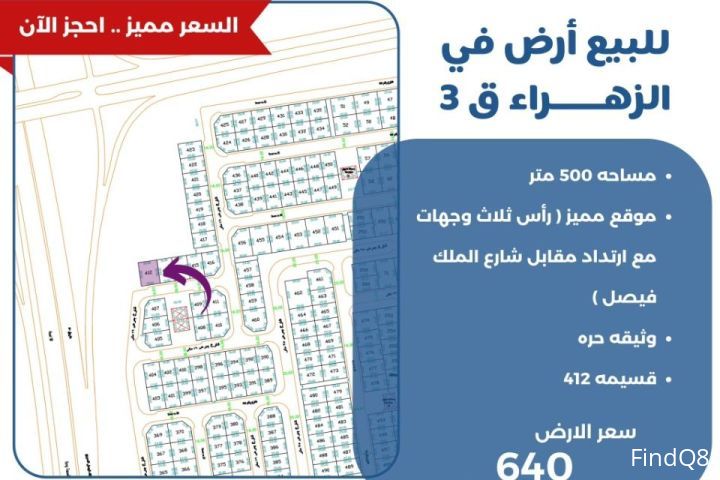 للبيع ارض في الزهراء قطعة 3 مساحة 500 متر موقع مميز رأس ثلاث وجهات مع ارتداد مقابل شارع الملك فيصل وثيقة حره سعر الارض 640 الف