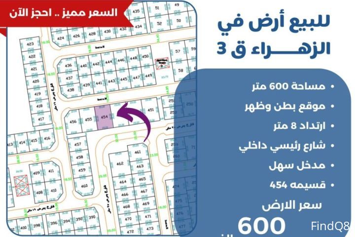 للبيع ارض في الزهراء قطعة 3 مساحة 600 متر موقع بطن وظهر ارتداد 8 متر شارع رئيسي داخلي مدخل سهل قسيمة 454 سعر الارض 600 الف
