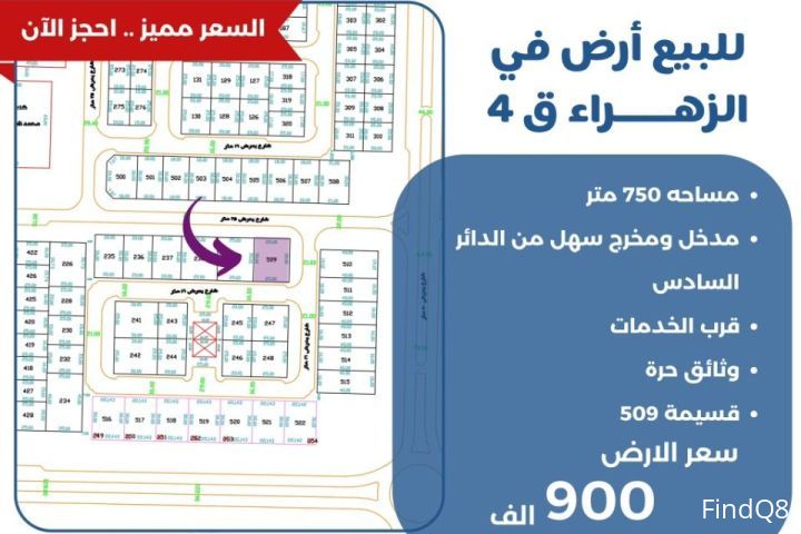 للبيع ارض في الزهراء قطعه 4 مساحة 750 متر مدخل ومخرج سهل من الدائر السادس وثيقه حره قسيمة 509 سعر الارض 900 الف