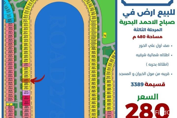 للبيع ارض في صباح الاحمد البحرية المرحلة الثالثة مساحة 480 متر صف اول على الخور اطلالة شمالية شرقية اطلالة بحرية قريبه من مول الخيران والمسجد قسيمة 3389 السعر 280 الف