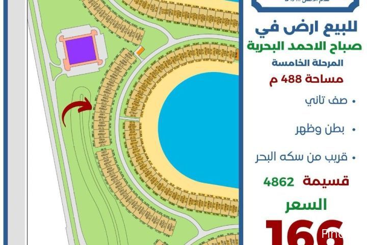 للبيع ارض في صباح الاحمد البحرية المرحلة الخامسة صف ثاني مساحة 488 متر بطن وظهر وقريب من سكه البحر السعر 166 الف قسيمة 4862