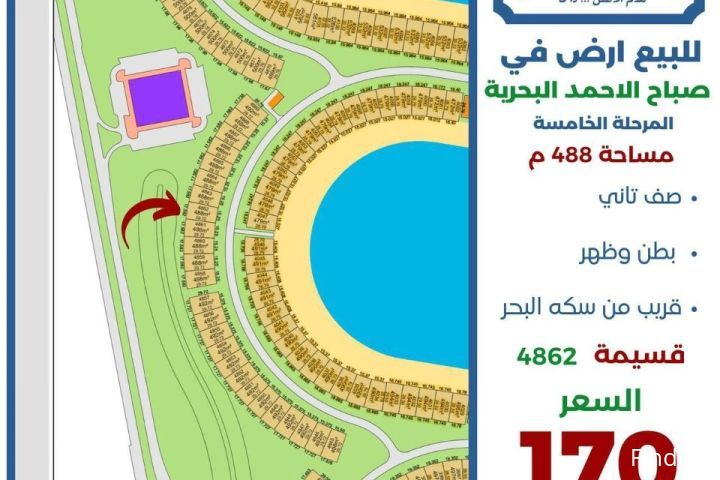 للبيع ارض في صباح الاحمد البحرية المرحلة الخامسة صف ثاني مساحة 488 متر بطن وظهر وقريب من سكه البحر السعر 170 الف قسيمة 4862