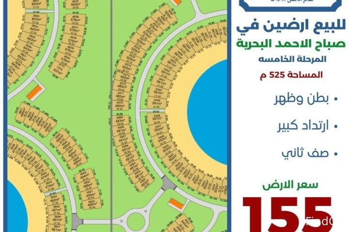 للبيع ارض في صباح الاحمد البحرية المرحلة الخامسة المساحة 525 متر بطن وظهر ارتداد كبير صف ثاني سعر الارض 155 الف دينار