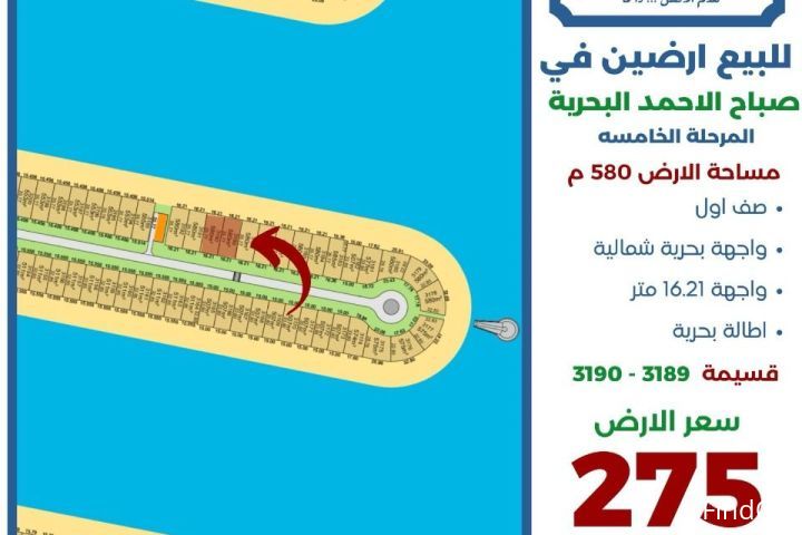 للبيع ارض في صباح الاحمد البحرية المرحلة الخامسة مساحة الارض 580 متر صف اول واجهه بحرية شمالية واجهه 16.21 متر اطلالة بحرية قسيمة 3189 السعر 275 الف