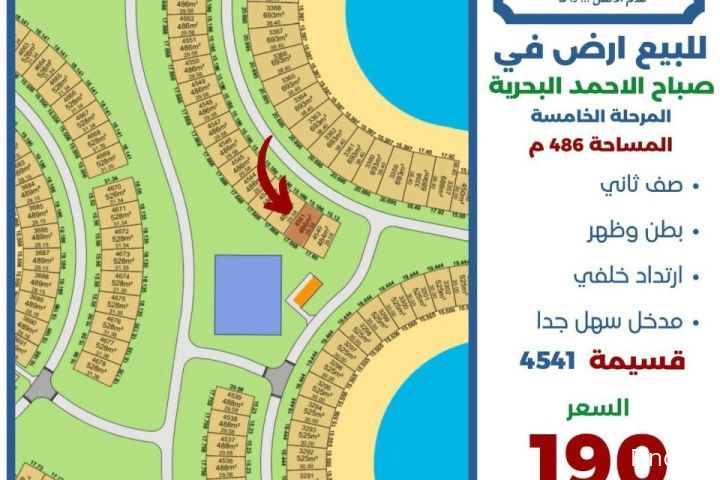 للبيع ارض في صباح الاحمد البحرية المساحة 486 متر صف ثاني بطن وظهر ارتداد خلفي مدخل سهل جدا قسيمة 4541 السعر 190 الف