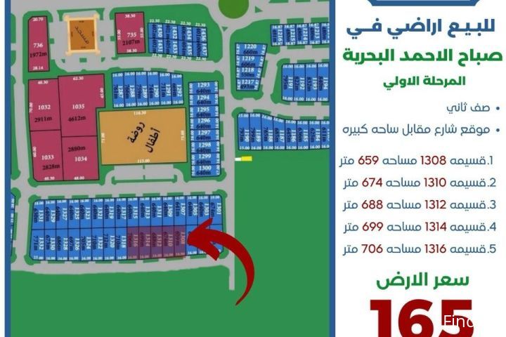 للبيع ارض في صباح الاحمد البحريه المرحله الاوله صف ثاني موقع شارع مقابل ساحه كبيره قسيمه 1308 مساحه 659 متر قسيمه 1310 مساحه 674 متر قسيمه 1312 مساحه 688 متر قسيمه 1314 مساحه 699 متر قسيمه 1316 مساحه 706 متر سعر الارض 165 الف