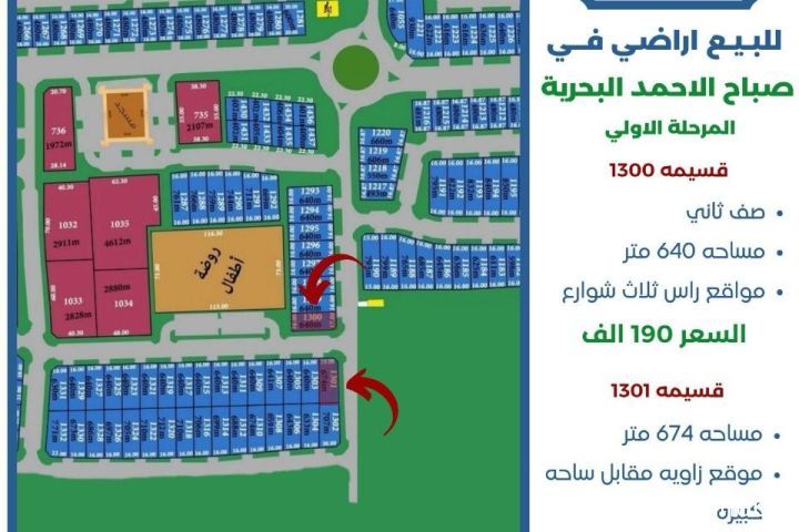 للبيع ارض في صباح الاحمد البحريه المرحله الاول صف ثاني قسيمه 1300 مساحه 640 متر مواقع راس ثلاث شوارع السعر 190 الف قسيمه 1301 مساحه 674 متر موقع زاويه مقابل ساحه كبيره السعر 180 الف