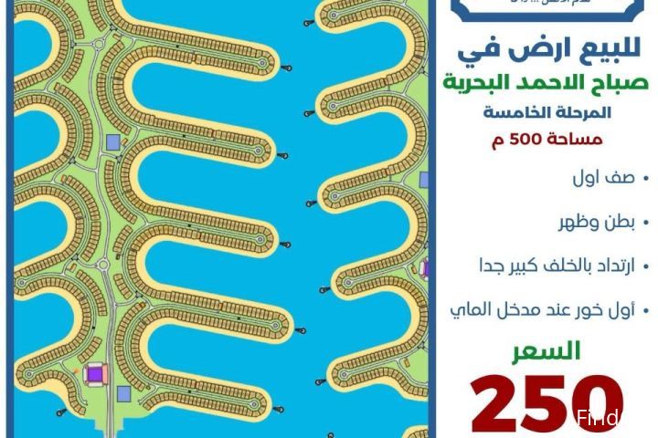 للبيع ارض في صباح الاحمد البحرية المرحلة الخامسة مساحة 500 متر صف اول بطن وظهر ارتداد بالخلف كبير جدا اول خور عند مدخل الماي