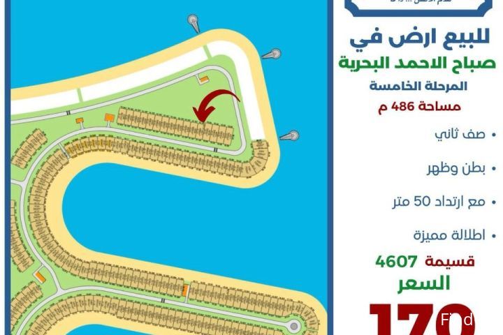 للبيع ارض في صباح الاحمد البحرية مساحة 486 متر المرحلة الخامسة صف ثاني بطن وظهر مع ارتداد 50 متر اطلالة مميزة قسيمة 4607 السعر 170 الف