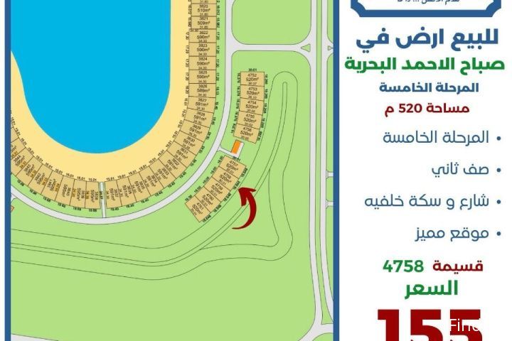 للبيع ارض في صباح الاحمد البحرية المرحلة الخامسة مساحة 520 متر صف ثاني على شارع وسكه خلفية السعر 155 الف