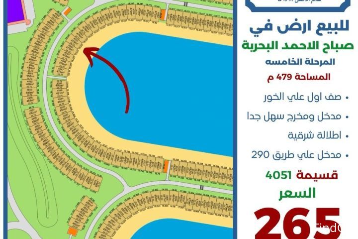 للبيع ارض في صباح الاحمد البحرية المرحلة الخامسة المساحة 479 متر صف اول على الخور مدخل ومخرج سهل جدا اطلالة شرقية مدخل على طريق 290 قسيمة 4051 السعر 265 الف