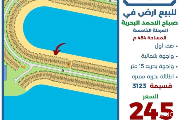 للبيع ارض في صباح الاحمد البحرية المرحلة الخامسة المساحة 484 متر صف اول واجهه شمالية واجهه بحرية 15 متر اطلالة بحرية السعر 245 الف