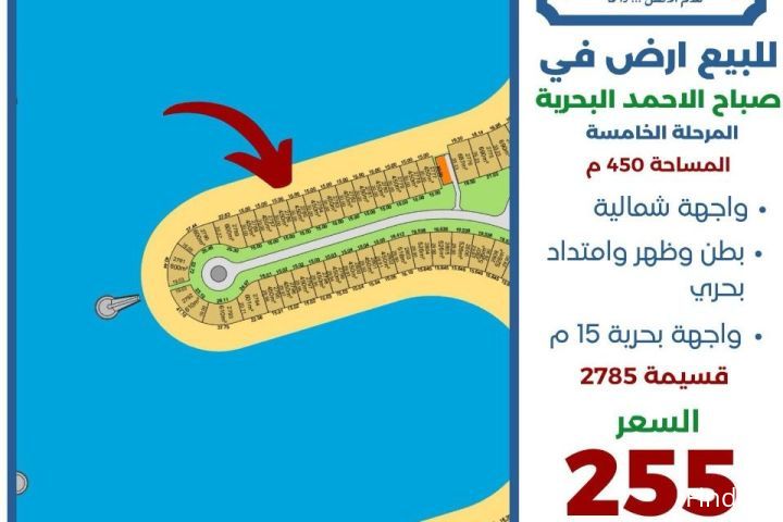 للبيع ارض في صباح الاحمد البحرية المرحلة الخامسة المساحة 450 متر واجهه شمالية بطن وظهر وامتداد بحري واجهه بحرية 15 متر السعر 255 الف