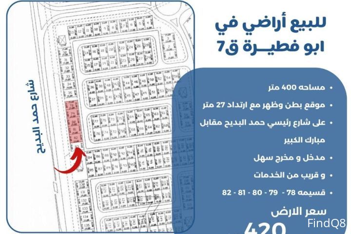 للبيع اراضي في ابو فطيرة قطعة 7 مساحة 400 متر موقع بطن وظهر مع ارتداد 20 متر على شارع رئيسي حمد البديح مقابل مبارك الكبير مدخل ومخرج سهل وقريب من الخدمات سعر الارض 420 الف