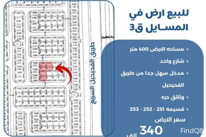 للبيع ارض في المسايل قطعة 3 مساحة الارض 400 متر شارع واحد مدخل سهل جدا من طريق الفحيحيل وثائق حره سعر الارض 340 الف