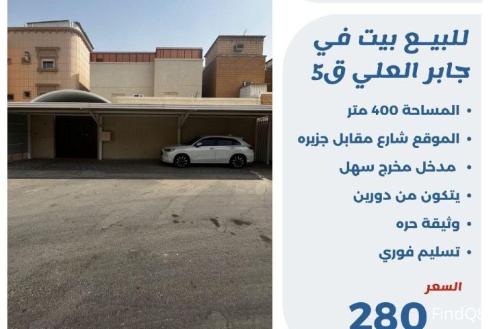 للبيع بيت في جابر العلي قطعة 5 المساحة 400 متر الموقع شارع مقابل جزيره مدخل و مخرج سهل يتكون من دورين وثيقة حره السعر 280 الف