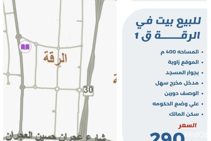 للبيع بيت في الرقه قطعه 1 المساحة 400 متر الموقع زاوية بجوار المسجد مدخل ومخرج سهل الوصف دورين على وضع الحكومه سكن المالك السعر 290 الف