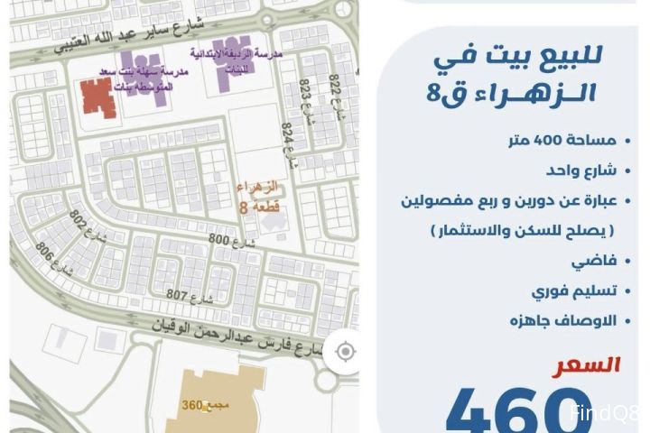 للبيع بيت في الزهراء قطعة8 مساحة 400 متر شارع واحد عبارة عن دورين وربع مفصولين (يصلح للسكن والإستثمار) فاضي تسليم فوري الاوصاف جاهزة السعر 460 الف