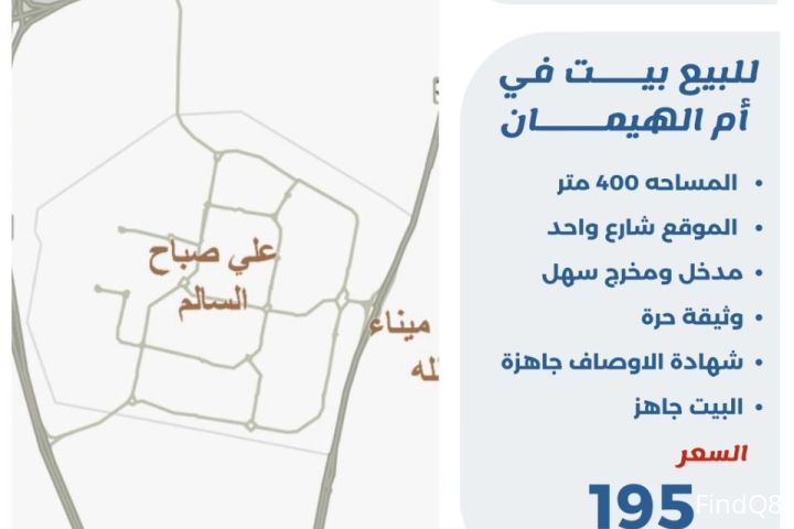 للبيع بيت في ام الهيمان المساحة 400 متر الموقع شارع واحد مدخل ومخرج سهل وثيقه حره شهادة الاوصاف جاهزة البيت جاهز السعر 195 الف