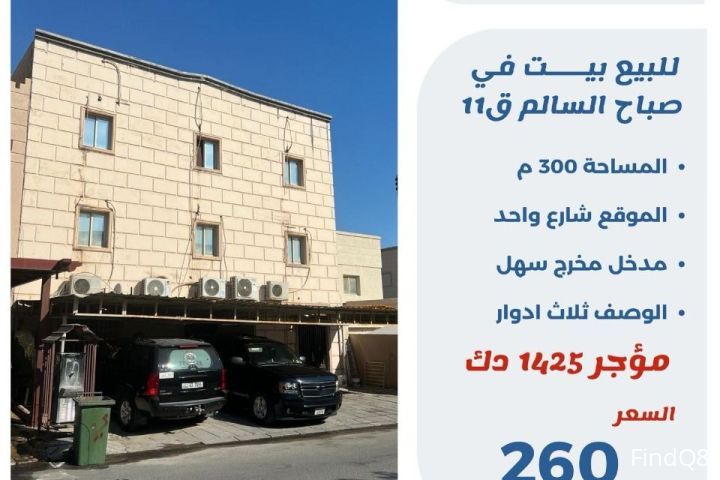للبيع بيت في صباح السالم قطعة 11 المساحة 300 متر الموقع شارع واحد مدخل مخرج سهل الوصف ثلاث ادوار مؤجر 1425 دينار السعر 260 الف