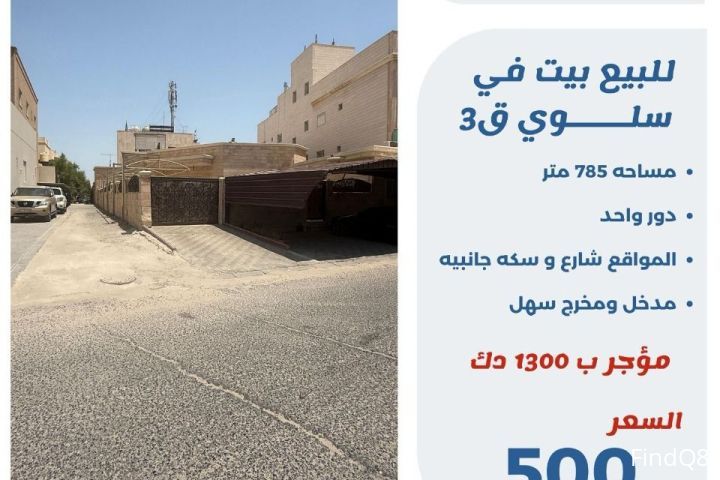للبيع بيت في سلوى قطعة 3 مساحة 785 متر دور واحد الموقع شارع وسكه جانبيه مدخل ومخرج سهل مؤجر 1300 دك السعر 500 الف