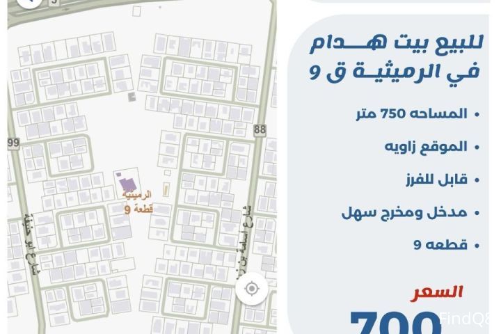 للبيع بيت هدام في الرميثيه قطعه 9 المساحه 750 متر الموقع زاويه قابل للفرز مدخل ومخرج سهل السعر 700 الف