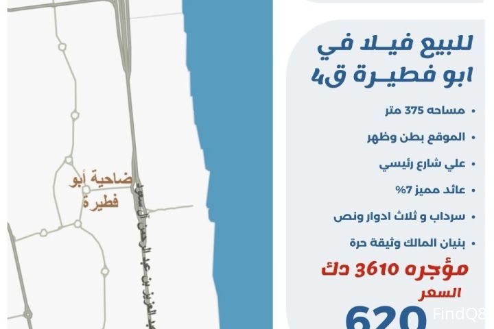 للبيع فيلا في ابوفطيره قطعة 4 المساحه 375 متر الموقع بطن وظهر علي شارع رائيسي مدخل مخرج سهل الوصف سرداب و ثلاث ادوار ونص بنيان المالك وثيقة حرة مؤجره 3610 دينار السعر 620 الف