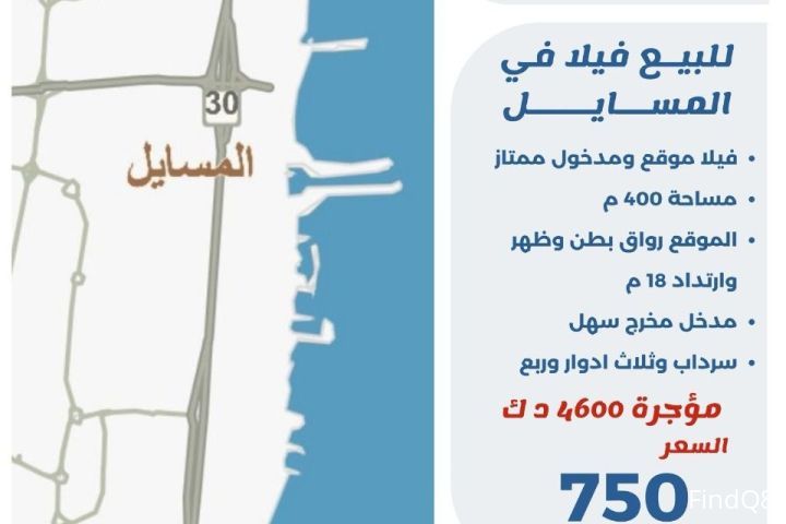 للبيع فيلا في المسايل فيلا موقع ومدخول ممتاز مساحة 400 متر الموقع رواق بطن وظهر وارتداد 18 متر مدخل مخرج سهل سرداب وثلاث ادوار وريع مؤجره 4600 دينار السعر 750 الف