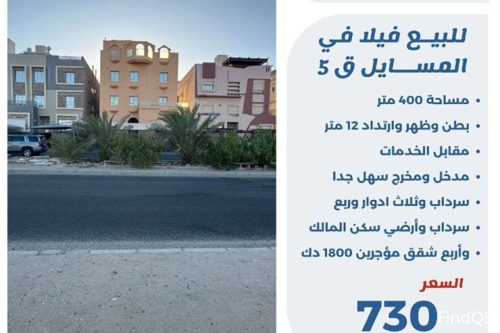 للبيع فيلا في المسايل قطعة 5 مساحة 400 متر بطن وظهر وارتداد 12 متر مقابل الخدمات مدخل ومخرج سهل جدا سرداب وثلاث ادوار وربع سرداب وارضي سكن المالك واربع شقق مؤجرين 1800 دينار السعر 730 الف