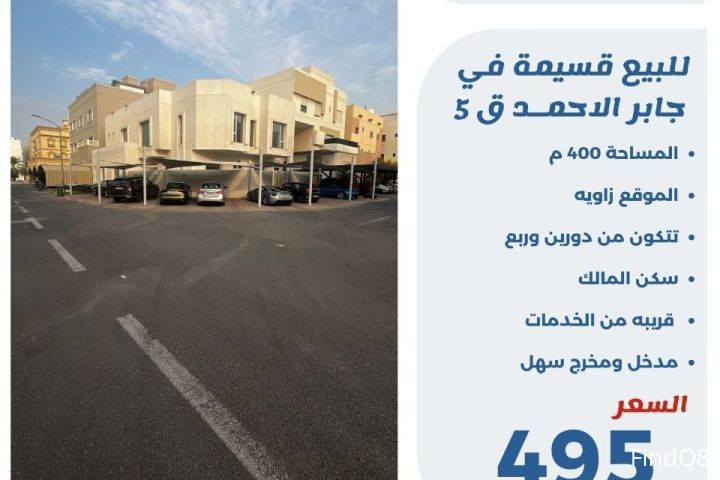 للبيع قسيمة في جابر الاحمد قطعة 5 المساحة 400 الموقع زاوية تتكون من دورين وربع سكن المابك قريبه من الخدمات مدخل ومخرج سهل السعر 495 الف